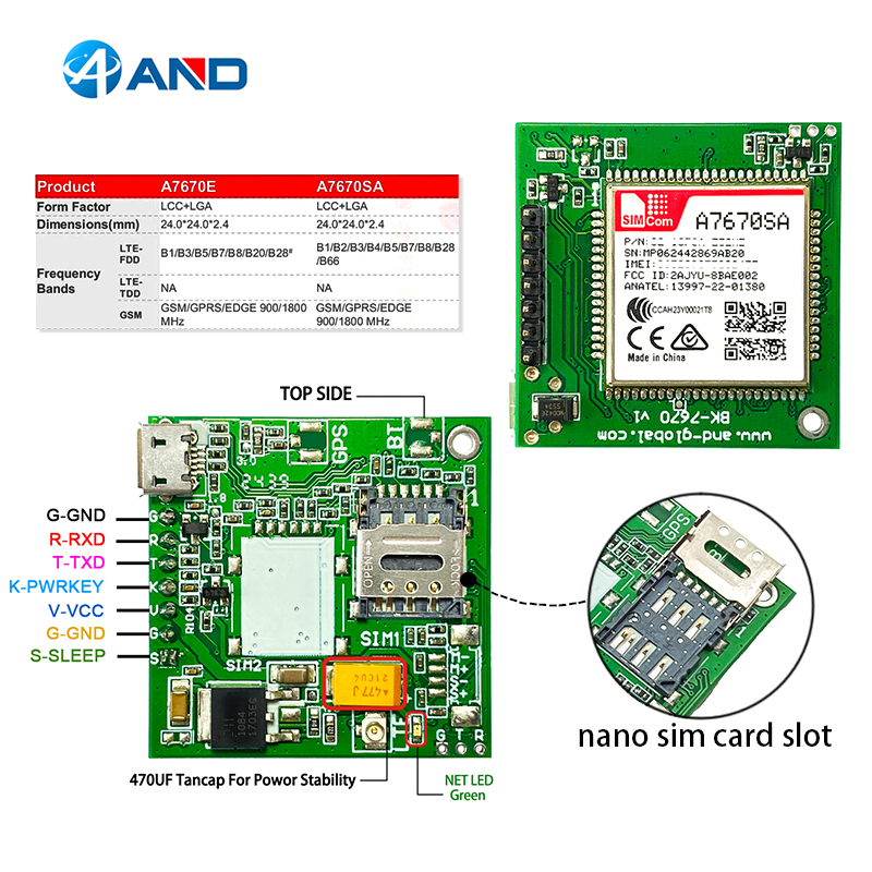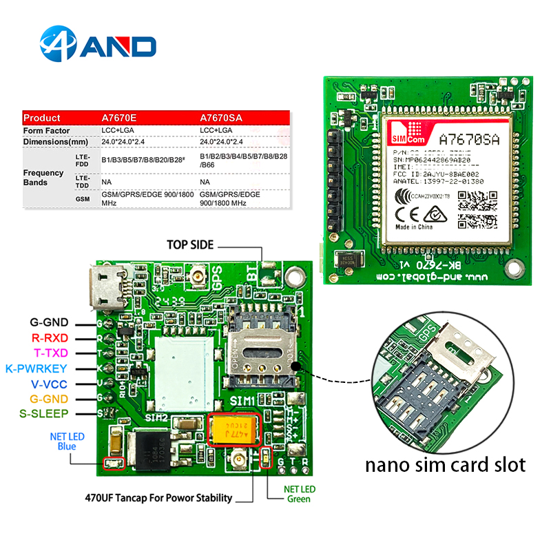 The A7670E/A7670SA adopts LGA form factor and iscompatible with SIM7000/SIM7070 series(NB/Cat Mmodules),